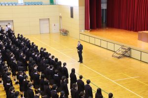 4月20日(月)体育館にて全校集会が開かれ、山本校長先生より今年度の教育目標が全生徒に伝えられました。