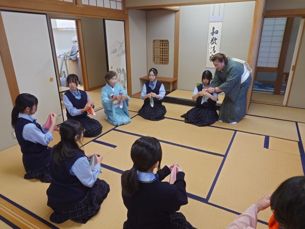 本校より10名の生徒が参加し、帛紗の捌き方等を教えていただき、お茶やお菓子も楽しませていただきました。